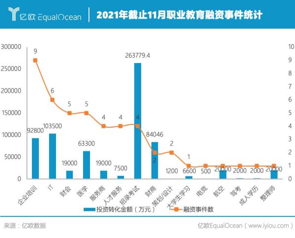 根据亿欧智库数据显示,2021年截止11月,职业教育融资事件中,A轮融资和并购项目数量最多超过行业整体的三分之一,而从细分的投资方向来看,企业培训类企业在今年的融资较多,IT、招录考试、财商和医学类赛道也是资本市场较为活跃和关注的领域。