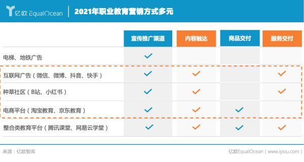 由于职业教育的技能专业性程度高,因此在营销模式上,侧重于覆盖个性化推荐的直播社交、种草社区和电商平台等。通过渠道的多元化弥补职业教育个性化的营销短板。同时在教学形式上,服务内容从由单一的课程体系转化为包含课程、学习计划和社群服务等内容的一体化解决方案,其目的在于职业教育学习者打破空间、时间束缚地进行学习积累,实现服务价值和效果提升。
