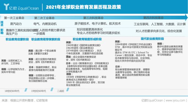 第一次工业革命后,以学徒制为主的职业教育萌芽出现,主要以英国、德国职业教育体系为代表;二战后,各国产业结构呈现多元丰富的发展趋势,职业教育逐步实现制度化、体系化发展,英美日德各自颁布职业教育相关法律促进职业教育规范化发展;信息化时代来临,信息网络数字化为主的职业教育培训迎来新的发展期。