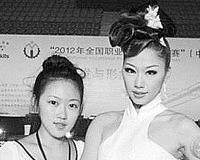张精(左)及其模特 张精是个热爱形象设计的女生,凭借娴熟的技艺和手法,今年24岁的她曾分别获得2011年.. |