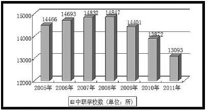 我国的中职教育规模巨大。截至2011年,全国中等职业学校有13093所,占高中阶段总量的48%以上;中职招生人数占普通高中阶段招生总数的49%。即便从世界范围来看,我国中职生所占比例达到或高于发达国家平均水平,略低于欧盟21国52.4%,但高于20国集团37.6%的平均水平,居于世界前列。