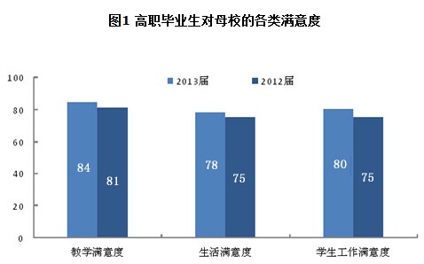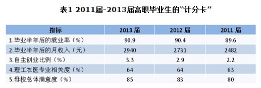 麦可思调查发现,2013年“计分卡”的5项指标,相对于前两年有4项呈现增长态势,只有专业相关度一项保持稳定。