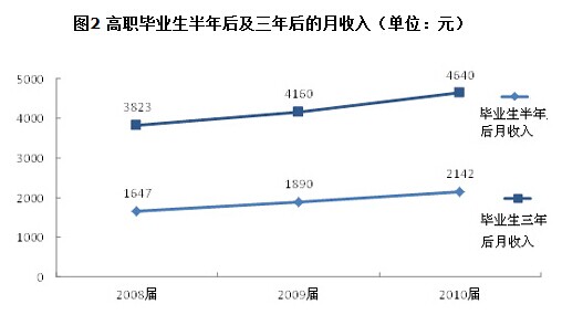麦可思对毕业生的职业发展能力进行了调查。调查发现,高职毕业生三年后收入翻了一番,增速高于城镇单位在岗职工的平均水平,六成左右实现了职位晋升,呈现出较为强劲的职业发展能力。(见图2)