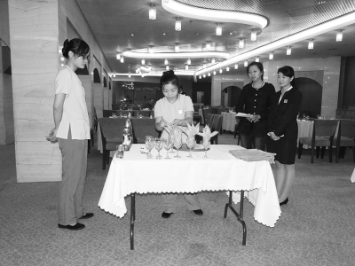湖州艺术与设计学校酒店服务与管理专业学生正在进行摆台培训。