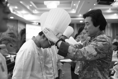 烹饪大师李林生为德清县职业中等专业学校烹饪专业学徒授帽。