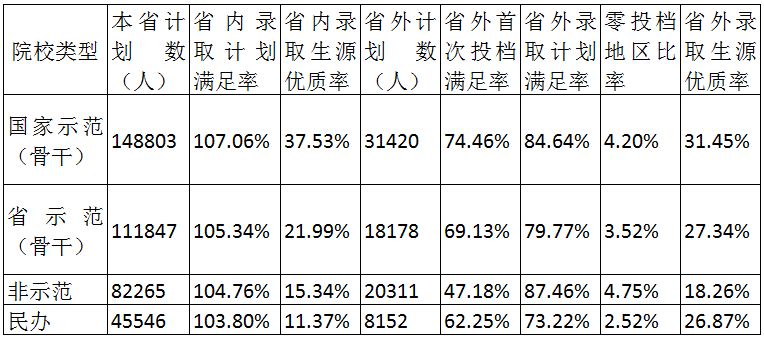 与民办院校相比,从具有较强说服力的“省内录取计划满足率”、“省内录取生源优质率”、“省外录取生源优质率”等3个指标来看,非示范类院校优势突出。
