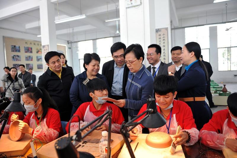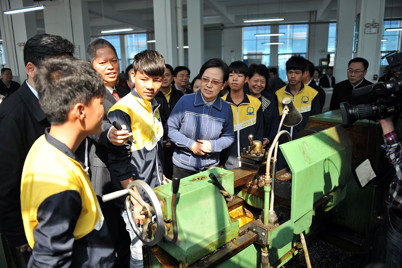 在钦州职教中心机械加工实训基地,鲁昕亲切地与学生交流,详细询问了他们在学校学习技术的情况。2014级模具制造技术专业学生曾详参今年6月出去打了一个月的工,体会到没有技术的艰辛,毅然选择回校学习。他对鲁昕说,“我认识到没有技术打工的辛苦,我会好好珍惜在学校学技术的机会,把技术学好。”在钦州职教中心坭兴陶展示体验中心,鲁昕认真观看了学生制作和雕刻坭兴陶的过程,以及参观了他们从一进校门烧制的作品到技术越来越娴熟的作品。