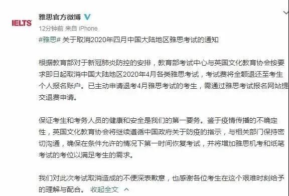 根据教育部对于新冠肺炎防控的安排,教育部考试中心与英国文化教育协会按要求即日起取消中国大陆地区2020年4月各类雅思考试,考试费将全额退还至考生个人报名账户。已主动申请退考4月雅思考试的考生,需通过雅思考试报名网站提交退费申请。