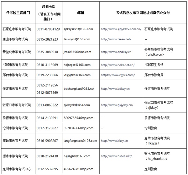 本次考试共设12个考区,分别为11个设区市和定州市。所有考生均可在户籍地或居住证(有效期内)申领地报考。辛集市考生请选择石家庄考区。