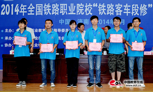 中国教育在线讯 5月29日,2014年全国铁路职业院校“铁路客车段修”技能竞赛在山东职业学院圆满落幕。闭幕式上,山东职业学院党委书记王荣昌、副院长徐冬、铁道车辆专业教学指导委员会主任袁清武,铁道车辆专业教学指导委员会副主任、竞赛总裁判长刘志明,铁道车辆专业教学指导委员会委员董黎生为获奖个人颁发了荣誉证书。