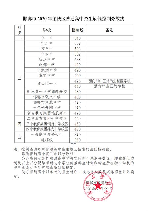 2020年邯郸市主城区普通高中招生最低控制分数线