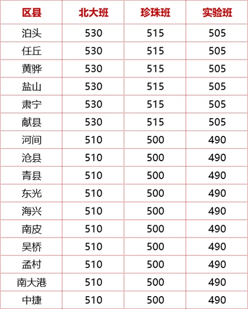 本部各类班级控制分数为:其中,明珠班505分实验班470分;奋进班440分;普通班430分;文化路校区全市录取基准线为405分。各初中校依据分配指标,由黄骅市教育局划定具体录取分数线。