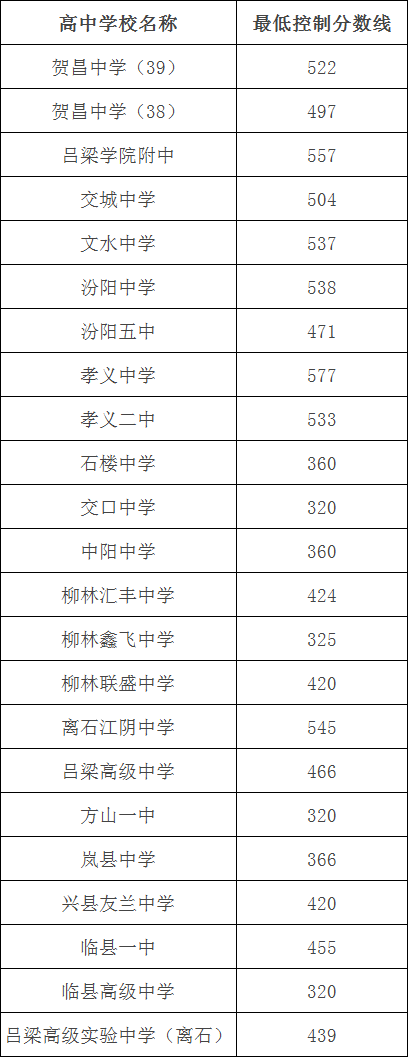 2020年山西吕梁中考首批高中录取最低控制分数线
